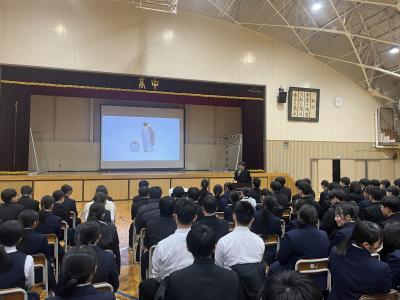 12/11(木)午後に、高校2学年の生徒によるこれまでの学習成果の発表会が行われました。普段は別々に行っているGSコース、普通コースの総合的な探究の時間での成果を発表し合い、共有するとともに、⑦校時の時間帯では、課外の時間を使って各自が自主的に活動した成果について紹介してもらいました。