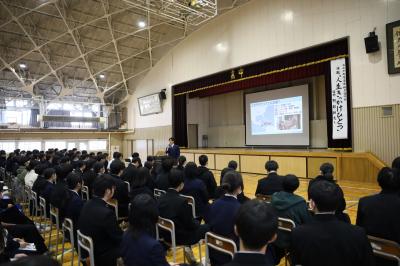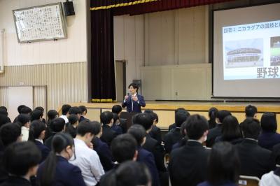12月17日(水)に、1・2学年合同で国際協力講演会を実施しました。講師はJICA青森デスクの阿部翔太さん。「人生キッカケひとつ」という演題で、ニカラグアで女子野球チームを発足させた経験をお話しいただきました。