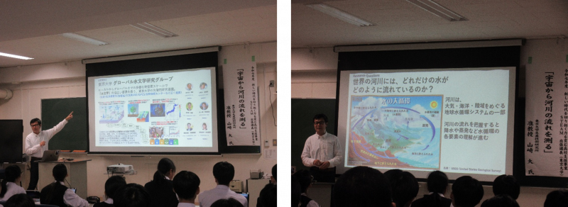前半の講義では「宇宙から河川の流れを測る」と題し、水文学・グローバル流体力学に関する授業が行われました。はじめに、山崎先生の研究している研究基盤について複雑な大陸河川の流れをどのように計算するかなど、世界最先端の高解像度地形データの活用などが紹介されました。次に、世界の河川には、どれだけの水がどのように流れているかという大循環についての説明を聞きました。