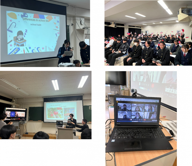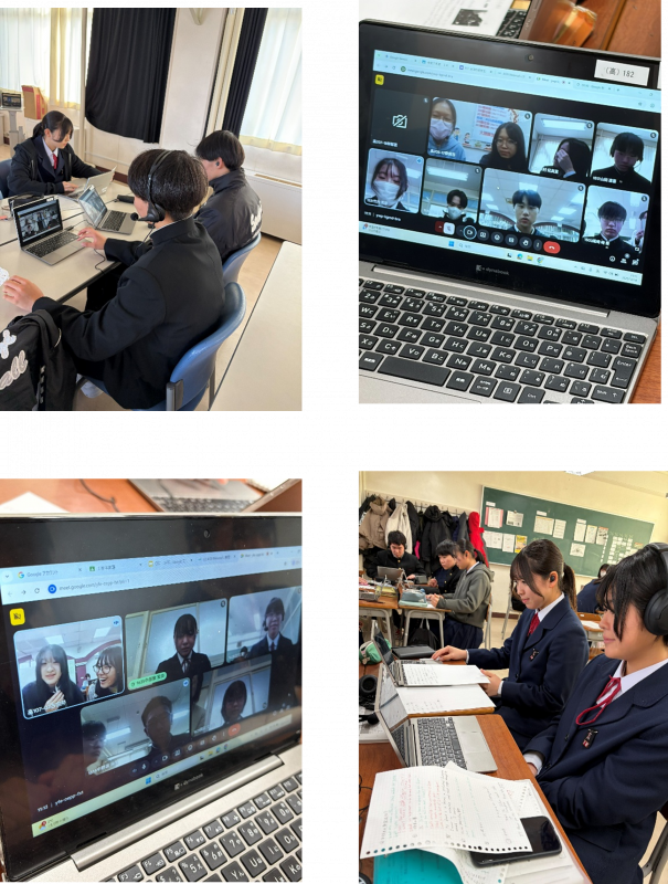令和7年11月11日(火)、12月11日(木)に1年生のGSコース5組・6組のみなさんと台湾台臺市立大理高級中学校とのオンライン交流第1回、第2回が行われました。第1回は三本木高校からの英語でのプレゼンテーション、第2回はグループに分かれ一人ひとりのタブレットを使っての交流となります。