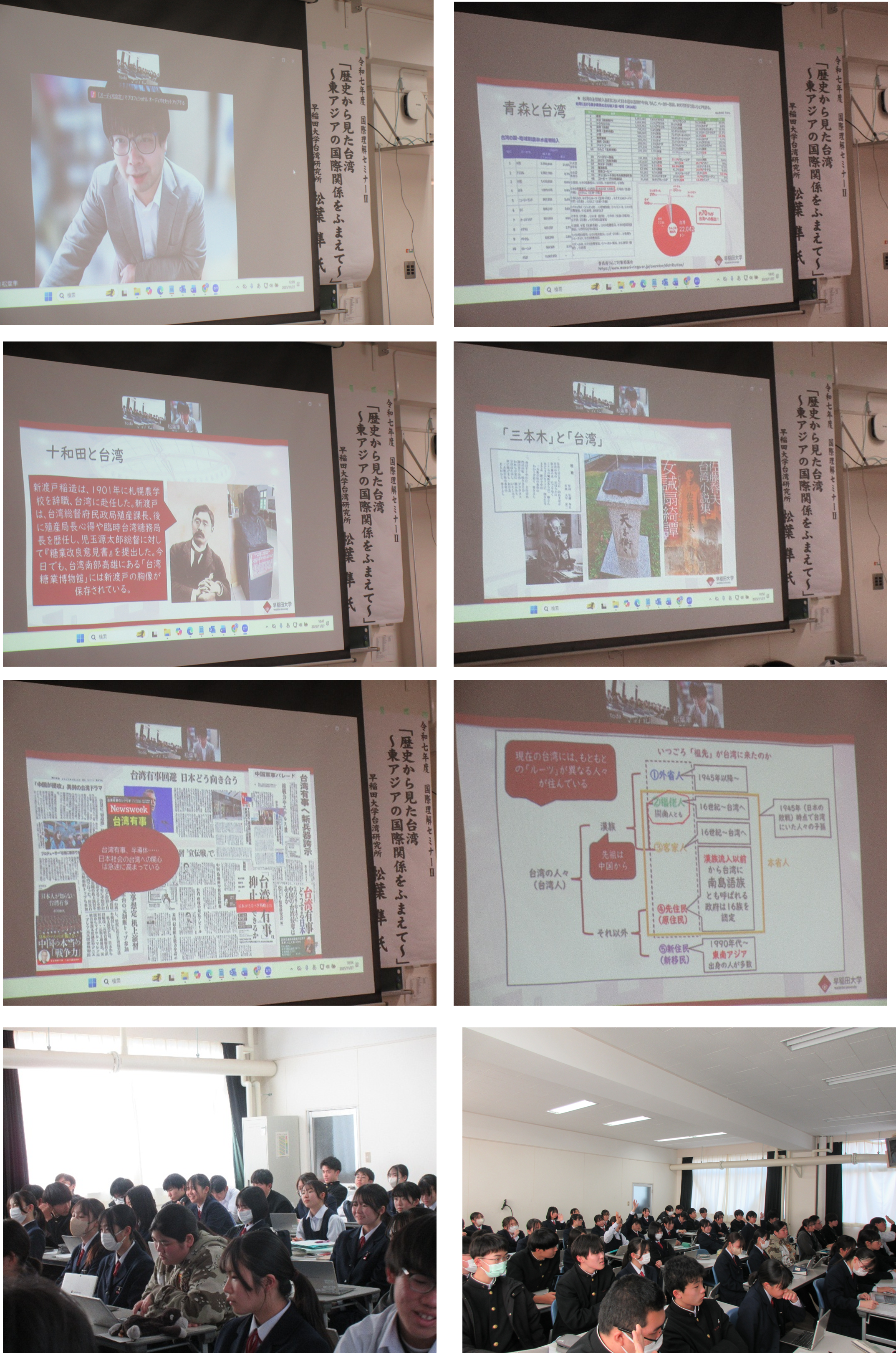 講義では、青森県知事や高雄市長、むつ市長が台湾で料理をする動画が紹介されました。また、青森から年間2万トンものリンゴが台湾へ輸出されていることや、台湾ではホタテが高い人気を得ていることなど、青森と台湾とのつながりを身近な例を交えて示されました。また、三本木高校の校歌の作詞を佐藤春夫先生が担当していることに触れられたり、台湾の鉄道では五か国語による車内アナウンスが行われていたりすること、両国間の観光客数が日本から台湾へ約130万人、台湾から日本へは約600万人に上ることなど、台湾社会の特徴や日本との関係性について幅広く紹介されました。さらに、台湾の歴史が国際関係の中でどのように形づくられてきたかについても、丁寧な解説が行われました。